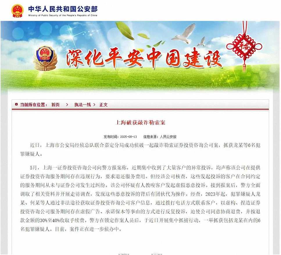 近期,证券投资咨询行业投诉量呈现异常增长态势,部分持牌机构集中收到大量历史客户的退费诉求。上海市公安局经侦总队披露,此类现象背后暗藏非法代理维权团伙的恶意操作。警方近期成功侦破一起敲诈勒索证券投顾公司案件,抓获6名犯罪嫌疑人,查证非法获利600余万元,再次释放对该领域违法犯罪“零容忍”的信号。